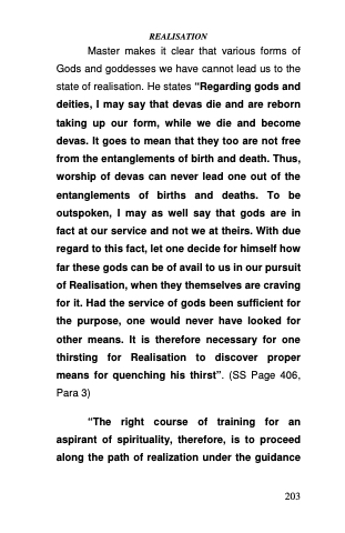 Master makes it clear that various forms of Gods and goddesses we have cannot lead us to the state of realisation. He states “Regarding gods and deities, I may say that devas die and are reborn taking up our form, while we die and become devas. It goes to mean that they too are not free from the entanglements of birth and death. Thus, worship of devas can never lead one out of the entanglements of births and deaths. To be outspoken, I may as well say that gods are in fact at our service and not we at theirs. With due regard to this fact, let one decide for himself how far these gods can be of avail to us in our pursuit of Realisation, when they themselves are craving for it. Had the service of gods been sufficient for the purpose, one would never have looked for other means. It is therefore necessary for one thirsting for Realisation to discover proper means for quenching his thirst”. (SS Page 406, Para 3)
