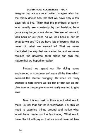 imagine that we are much older. Imagine also that the family doctor has told that we have only a few days left to live. Think that the members of family, who usually are constantly by our bedside, have gone away to get some dinner. We are left alone to look back on our past. As we look back at our life what do we see? Do we have lots of regrets: that we never did what we wanted to? That we never meditated the way that we wanted to, and we never realized the universal truth about our own real nature that we hoped to realize.