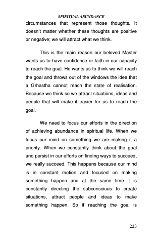 This is the main reason our beloved Master wants us to have confidence or faith in our capacity to reach the goal. He wants us to think we will reach the goal and throws out of the windows the idea that a Grhastha cannot reach the state of realisation. Because we think so we attract situations, ideas and people that will make it easier for us to reach the goal.