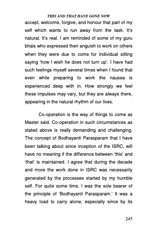 Co-operation is the way of things to come as Master said. Co-operation in such circumstances as stated above is really demanding and challenging. The concept of Bodhayanti Parasparam that I have been talking about since inception of the ISRC, will have no meaning if the difference between ‘this’ and ‘that’ is maintained. I agree that during the decade and more the work done in ISRC was necessarily generated by the processes started by my humble self. For quite some time, I was the sole bearer of the principle of ‘Bodhayanti Parasparam.’ It was a heavy load to carry alone, especially since by its