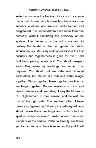 suited to continue the tradition. Once such a choice made that chosen disciple some how becomes more superior to others who are also well informed and enlightened. It is impossible to have more than one authority without sacrificing the efficiency of the system. The hierarchy is the out come and to destroy the ladder is the first game that starts simultaneously. Mutuality and cooperation is the first casuality and togetherness is gone for ever. Lord Buddha’s’ parting words are” You should respect each other, follow my teachings, and refrain from disputes. You should not like water and oil repel each other, but should like milk and water mingle together. Study together, learn together practice my teachings together. Do not waste your mind and time in idleness and quarrelling. Enjoy the blossoms of Enlightenment in their season and harvest the fruit of the right path. The teaching which I have given you, I gained by following the path myself. You should follow these teachings and conform to their spirit on every occasion.” Similar words from other founders of the various Paths to Divinity are there: yet the fact remains there is more conflict and ill will