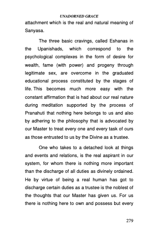 The three basic cravings, called Eshanas in the Upanishads, which correspond to the psychological complexes in the form of desire for wealth, fame (with power) and progeny through legitimate sex, are overcome in the graduated educational process constituted by the stages of life.This becomes much more easy with the constant affirmation that is had about our real nature during meditation supported by the process of Pranahuti that nothing here belongs to us and also by adhering to the philosophy that is advocated by our Master to treat every one and every task of ours as those entrusted to us by the Divine as a trustee.