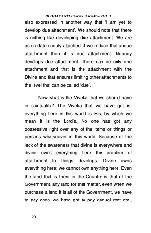 Now what is the Viveka that we should have in spirituality? The Viveka that we have got is, everything here in this world is His, by which we mean it is the Lord’s. No one has got any possessive right over any of the items or things or persons whatsoever in this world. Because of the lack of the awareness that divine is everywhere and divine owns everything here the problem of attachment to things develops. Divine owns everything here; we cannot own anything here. Even the land that is there in the Country is that of the Government, any land for that matter, even when we purchase a land it is all of the Government, we have to pay cess, we have got to pay annual rent etc.,
