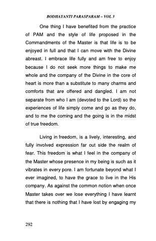 One thing I have benefited from the practice of PAM and the style of life proposed in the Commandments of the Master is that life is to be enjoyed in full and that I can move with the Divine abreast. I embrace life fully and am free to enjoy because I do not seek more things to make me whole and the company of the Divine in the core of heart is more than a substitute to many charms and comforts that are offered and dangled. I am not separate from who I am (devoted to the Lord) so the experiences of life simply come and go as they do, and to me the coming and the going is in the midst of true freedom.