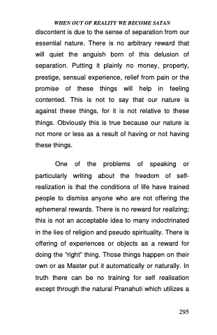discontent is due to the sense of separation from our essential nature. There is no arbitrary reward that will quiet the anguish born of this delusion of separation. Putting it plainly no money, property, prestige, sensual experience, relief from pain or the promise of these things will help in feeling contented. This is not to say that our nature is against these things, for it is not relative to these things. Obviously this is true because our nature is not more or less as a result of having or not having these things.