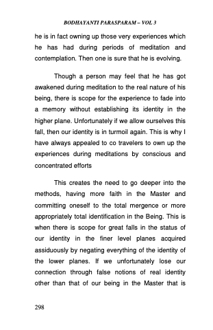 This creates the need to go deeper into the methods, having more faith in the Master and committing oneself to the total mergence or more appropriately total identification in the Being. This is when there is scope for great falls in the status of our identity in the finer level planes acquired assiduously by negating everything of the identity of the lower planes. If we unfortunately lose our connection through false notions of real identity other than that of our being in the Master that is