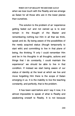 The solution to the problem of an ‘experience getting faded out’ and not owned up is to ever remain in the thought of the Master and remembering nothing but Him in all that we think, speak and do. By being aware of the possibilities of the newly acquired status (though temporarily to start with) and committing to live in that plane of being, the thinking “If only I could remember Him and be in his thoughts in all thoughts, actions and things that I do constantly, I could maintain the experience” we should be able to live in that condition. If instead we start being aware of our status of identity at the level at which we live and move forgetting Him there is the scope of Satan emerging in us. It is the inability to live the teaching constantly, and perfectly, that is the problem.