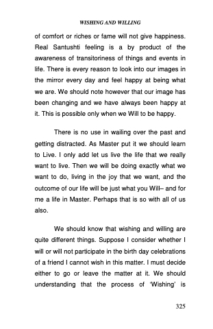 of comfort or riches or fame will not give happiness. Real Santushti feeling is a by product of the awareness of transitoriness of things and events in life. There is every reason to look into our images in the mirror every day and feel happy at being what we are. We should note however that our image has been changing and we have always been happy at it. This is possible only when we Will to be happy.