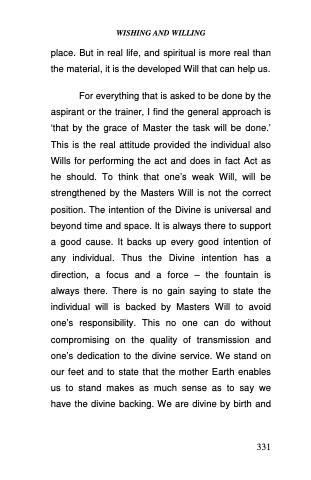 For everything that is asked to be done by the aspirant or the trainer, I find the general approach is ‘that by the grace of Master the task will be done.’ This is the real attitude provided the individual also Wills for performing the act and does in fact Act as he should. To think that one’s weak Will, will be strengthened by the Masters Will is not the correct position. The intention of the Divine is universal and beyond time and space. It is always there to support a good cause. It backs up every good intention of any individual. Thus the Divine intention has a direction, a focus and a force – the fountain is always there. There is no gain saying to state the individual will is backed by Masters Will to avoid one’s responsibility. This no one can do without compromising on the quality of transmission and one’s dedication to the divine service. We stand on our feet and to state that the mother Earth enables us to stand makes as much sense as to say we have the divine backing. We are divine by birth and