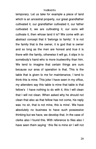 temporary. Let us take for example a piece of land which is an ancestral property, our great grandfather cultivated it, our grandfather cultivated it, our father cultivated it, we are cultivating it, our sons will cultivate it, then whose land it is? We come with an abstract concept that it ‘belongs to family’. It is not the family that is the owner, it is god that is owner and so long as the men are honest and true it is there with the family, otherwise it will go, it slips in to somebody’s hand who is more trustworthy than him. We tend to imagine that certain things are ours because our area of operation is that. This is the table that is given to me for maintenance, I tend to think this is mine. This joke I have seen in my office, my attenders say this table is mine that table is that fellow’s I have nothing to do with it, this I will clean that I will not clean. When asked why he should not clean that also as that fellow has not come, his reply was ‘no sir, that is not mine, this is mine’. We have absolutely no business to have such possessive thinking but we have, we develop that. In the case of clerks also I found this. With reference to files also I have seen them saying ‘ this file is mine sir I will not