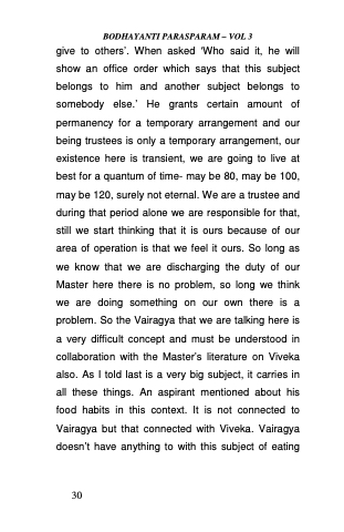 give to others’. When asked ‘Who said it, he will show an office order which says that this subject belongs to him and another subject belongs to somebody else.’ He grants certain amount of permanency for a temporary arrangement and our being trustees is only a temporary arrangement, our existence here is transient, we are going to live at best for a quantum of time- may be 80, may be 100, may be 120, surely not eternal. We are a trustee and during that period alone we are responsible for that, still we start thinking that it is ours because of our area of operation is that we feel it ours. So long as we know that we are discharging the duty of our Master here there is no problem, so long we think we are doing something on our own there is a problem. So the Vairagya that we are talking here is a very difficult concept and must be understood in collaboration with the Master’s literature on Viveka also. As I told last is a very big subject, it carries in all these things. An aspirant mentioned about his food habits in this context. It is not connected to Vairagya but that connected with Viveka. Vairagya doesn’t have anything to with this subject of eating