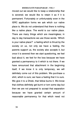 moved out we would like to keep a relationship that is severed; we would like to retain it as if it is permanent. Fortunately or unfortunately even in the ISRC application forms we ask which our native place is. We do not understand that there is nothing like a native place. The world is our native place. There are many things which are meaningless; in day to day transactions we use those words. ‘Which is your native place?’ a feeling which is thrust by the society on us, not only we have a feeling, the parents support us, the society also accepts it, but once it is severed then we start questioning, we feel bad about it, we feel for the loss because we have granted a permanency to it which is not there. If we have renounced that attachment in the beginning itself, if we know it is only temporary, we will definitely come out of this problem. We purchase a shirt, which is ours; we have a feeling that it is ours. We give it to a Dhobi, that fellow burns it. We know that clothes definitely get burnt or torn some day but then we are not prepared to accept that separation because we have granted certain amount of reasonable permanency for that which need not