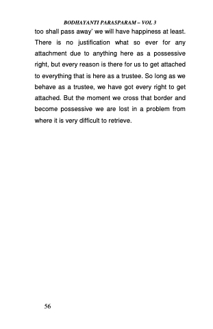 too shall pass away’ we will have happiness at least. There is no justification what so ever for any attachment due to anything here as a possessive right, but every reason is there for us to get attached to everything that is here as a trustee. So long as we behave as a trustee, we have got every right to get attached. But the moment we cross that border and become possessive we are lost in a problem from where it is very difficult to retrieve.