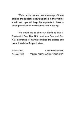 We hope the readers take advantage of these articles and speeches now published in this volume which we hope will help the aspirants to have a better perception of the Great Masters Rajayoga.