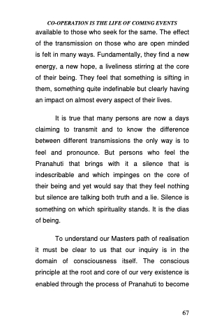 available to those who seek for the same. The effect of the transmission on those who are open minded is felt in many ways. Fundamentally, they find a new energy, a new hope, a liveliness stirring at the core of their being. They feel that something is sifting in them, something quite indefinable but clearly having an impact on almost every aspect of their lives.
