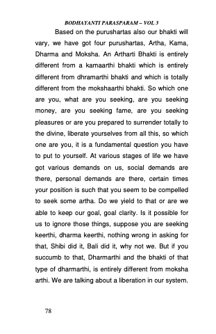Based on the purushartas also our bhakti will vary, we have got four purushartas, Artha, Kama, Dharma and Moksha. An Artharti Bhakti is entirely different from a kamaarthi bhakti which is entirely different from dhramarthi bhakti and which is totally different from the mokshaarthi bhakti. So which one are you, what are you seeking, are you seeking money, are you seeking fame, are you seeking pleasures or are you prepared to surrender totally to the divine, liberate yourselves from all this, so which one are you, it is a fundamental question you have to put to yourself. At various stages of life we have got various demands on us, social demands are there, personal demands are there, certain times your position is such that you seem to be compelled to seek some artha. Do we yield to that or are we able to keep our goal, goal clarity. Is it possible for us to ignore those things, suppose you are seeking keerthi, dharma keerthi, nothing wrong in asking for that, Shibi did it, Bali did it, why not we. But if you succumb to that, Dharmarthi and the bhakti of that type of dharmarthi, is entirely different from moksha arthi. We are talking about a liberation in our system.