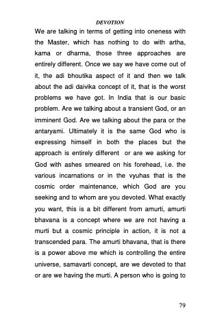 We are talking in terms of getting into oneness with the Master, which has nothing to do with artha, kama or dharma, those three approaches are entirely different. Once we say we have come out of it, the adi bhoutika aspect of it and then we talk about the adi daivika concept of it, that is the worst problems we have got. In India that is our basic problem. Are we talking about a transient God, or an imminent God. Are we talking about the para or the antaryami. Ultimately it is the same God who is expressing himself in both the places but the approach is entirely different or are we asking for God with ashes smeared on his forehead, i.e. the various incarnations or in the vyuhas that is the cosmic order maintenance, which God are you seeking and to whom are you devoted. What exactly you want, this is a bit different from amurti, amurti bhavana is a concept where we are not having a murti but a cosmic principle in action, it is not a transcended para. The amurti bhavana, that is there is a power above me which is controlling the entire universe, samavarti concept, are we devoted to that or are we having the murti. A person who is going to