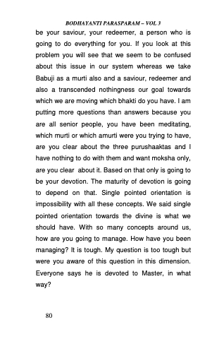 be your saviour, your redeemer, a person who is going to do everything for you. If you look at this problem you will see that we seem to be confused about this issue in our system whereas we take Babuji as a murti also and a saviour, redeemer and also a transcended nothingness our goal towards which we are moving which bhakti do you have. I am putting more questions than answers because you are all senior people, you have been meditating, which murti or which amurti were you trying to have, are you clear about the three purushaaktas and I have nothing to do with them and want moksha only, are you clear about it. Based on that only is going to be your devotion. The maturity of devotion is going to depend on that. Single pointed orientation is impossibility with all these concepts. We said single pointed orientation towards the divine is what we should have. With so many concepts around us, how are you going to manage. How have you been managing? It is tough. My question is too tough but were you aware of this question in this dimension. Everyone says he is devoted to Master, in what way?
