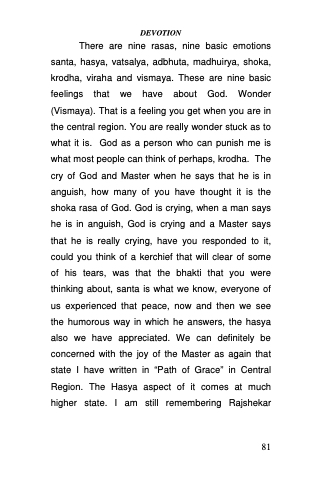 There are nine rasas, nine basic emotions santa, hasya, vatsalya, adbhuta, madhuirya, shoka, krodha, viraha and vismaya. These are nine basic feelings that we have about God. Wonder (Vismaya). That is a feeling you get when you are in the central region. You are really wonder stuck as to what it is. God as a person who can punish me is what most people can think of perhaps, krodha. The cry of God and Master when he says that he is in anguish, how many of you have thought it is the shoka rasa of God. God is crying, when a man says he is in anguish, God is crying and a Master says that he is really crying, have you responded to it, could you think of a kerchief that will clear of some of his tears, was that the bhakti that you were thinking about, santa is what we know, everyone of us experienced that peace, now and then we see the humorous way in which he answers, the hasya also we have appreciated. We can definitely be concerned with the joy of the Master as again that state I have written in “Path of Grace” in Central Region. The Hasya aspect of it comes at much higher state. I am still remembering Rajshekar
