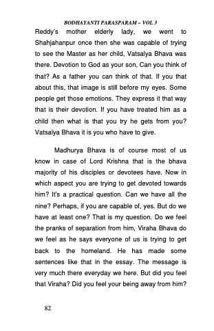 Reddy’s mother elderly lady, we went to Shahjahanpur once then she was capable of trying to see the Master as her child, Vatsalya Bhava was there. Devotion to God as your son, Can you think of that? As a father you can think of that. If you that about this, that image is still before my eyes. Some people get those emotions. They express it that way that is their devotion. If you have treated him as a child then what is that you try he gets from you? Vatsalya Bhava it is you who have to give.