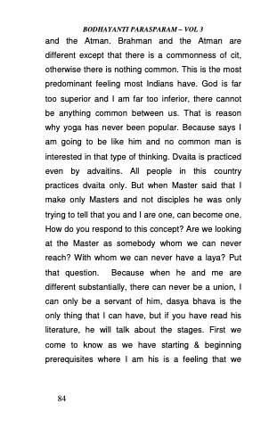 and the Atman. Brahman and the Atman are different except that there is a commonness of cit, otherwise there is nothing common. This is the most predominant feeling most Indians have. God is far too superior and I am far too inferior, there cannot be anything common between us. That is reason why yoga has never been popular. Because says I am going to be like him and no common man is interested in that type of thinking. Dvaita is practiced even by advaitins. All people in this country practices dvaita only. But when Master said that I make only Masters and not disciples he was only trying to tell that you and I are one, can become one. How do you respond to this concept? Are we looking at the Master as somebody whom we can never reach? With whom we can never have a laya? Put that question. Because when he and me are different substantially, there can never be a union, I can only be a servant of him, dasya bhava is the only thing that I can have, but if you have read his literature, he will talk about the stages. First we come to know as we have starting & beginning prerequisites where I am his is a feeling that we