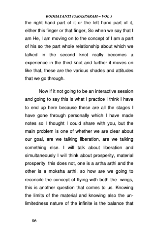 Now if it not going to be an interactive session and going to say this is what I practice I think I have to end up here because these are all the stages I have gone through personally which I have made notes so I thought I could share with you, but the main problem is one of whether we are clear about our goal, are we talking liberation, are we talking something else. I will talk about liberation and simultaneously I will think about prosperity, material prosperity this does not, one is a artha arthi and the other is a moksha arthi, so how are we going to reconcile the concept of flying with both the wings, this is another question that comes to us. Knowing the limits of the material and knowing also the un- limitedness nature of the infinite is the balance that