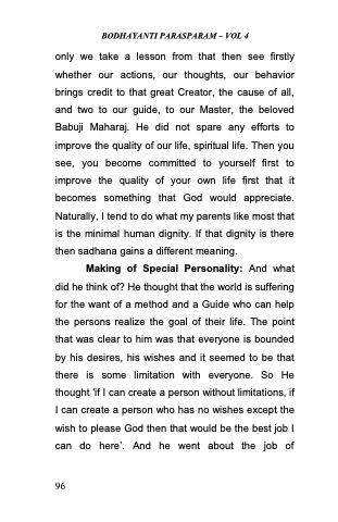 Making of Special Personality: And what did he think of? He thought that the world is suffering for the want of a method and a Guide who can help the persons realize the goal of their life. The point that was clear to him was that everyone is bounded by his desires, his wishes and it seemed to be that there is some limitation with everyone. So He thought ̳if I can create a person without limitations, if I can create a person who has no wishes except the wish to please God then that would be the best job I can do here‘. And he went about the job of