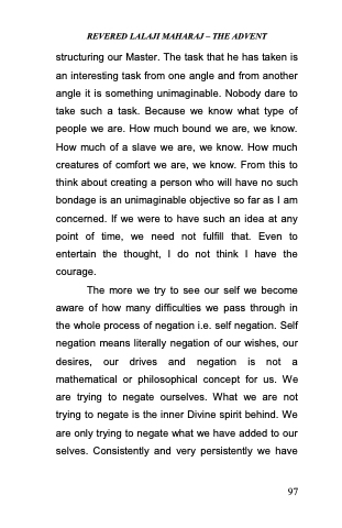 structuring our Master. The task that he has taken is an interesting task from one angle and from another angle it is something unimaginable. Nobody dare to take such a task. Because we know what type of people we are. How much bound we are, we know. How much of a slave we are, we know. How much creatures of comfort we are, we know. From this to think about creating a person who will have no such bondage is an unimaginable objective so far as I am concerned. If we were to have such an idea at any point of time, we need not fulfill that. Even to entertain the thought, I do not think I have the courage.