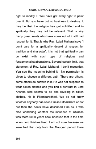 right to modify it. You have got every right to paint over it. But you have got no business to destroy. It may be that the religion has got solidified and in spiritually they may not be relevant. That is why many great saints who have come out of it still had respect for it. That is why Rev. Lalaji Maharaj says ̳I don‘t care for a spirituality devoid of respect for tradition and character‘. It is not that spirituality can co exist with such type of religious and fundamentalist aberrations. Beyond certain limit, that statement of Rev. Lalaji Maharaj, I don‘t recognize. You see the meaning behind it. No permission is given to choose a different path. There are others, some others do partake in it. He was not prepared to wear silken clothes and you find a contrast in Lord Krishna who seems to be one reveling in silken clothes, He is Pitambaradhari. We do not know whether anybody has seen Him in Pithambara or not but then the poets have described Him so. I was also wondering whether the influence of Chinese was there 6000 years back because that is the time when Lord Krishna lived. I am not sure because we were told that only from the Mauryan period there