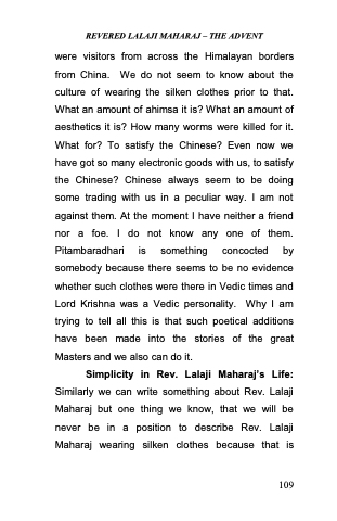 were visitors from across the Himalayan borders from China. We do not seem to know about the culture of wearing the silken clothes prior to that. What an amount of ahimsa it is? What an amount of aesthetics it is? How many worms were killed for it. What for? To satisfy the Chinese? Even now we have got so many electronic goods with us, to satisfy the Chinese? Chinese always seem to be doing some trading with us in a peculiar way. I am not against them. At the moment I have neither a friend nor a foe. I do not know any one of them. Pitambaradhari is something concocted by somebody because there seems to be no evidence whether such clothes were there in Vedic times and Lord Krishna was a Vedic personality. Why I am trying to tell all this is that such poetical additions have been made into the stories of the great Masters and we also can do it.