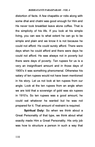 distortion of facts. A few chapattis or rotis along with some dhal and chatni was good enough for Him and He never took breakfast leave alone coffee. That is the simplicity of his life. If you look at his simple living, you can see to what extent he can go to be simple and plain and we know it is not because he could not afford. He could surely afford. There were days when he could afford and there were days he could not afford. He was always not in poverty but there were days of poverty. Ten rupees for us is a very an insignificant amount and in those days of 1900‘s it was something phenomenal. Otherwise his salary of ten rupees would not have been mentioned in his story. Let us not look at ten rupees from our angle. Look at the ten rupees from an angle when we are told that a sovereign of gold was six rupees in 1910‘s. So ten rupees was a good amount, he could eat whatever he wanted but he was not prepared for it. That amount of restraint is required.