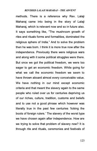 methods. There is a reference why Rev. Lalaji Maharaj came into being in the story of Lalaji Maharaj, which is relevant now and so in future also. It says something like, ‖The mushroom growth of rites and rituals forms and formalities, dominated the religious sphere of India.‖ And to solve the problem then he was born. I think it is more true now after the independence. Previously there were religious wars and along with it some political struggles were there. But once we got the political freedom, we were too eager to get an economic freedom. While going for what we call the economic freedom we seem to have thrown aboard almost every conceivable value. We have nothing in our mind except economic criteria and that meant the slavery again to the same people who ruled over us for centuries depriving us of our riches, culture, tradition, customs and beliefs and to use not a good phrase which however was literally true in the past few centuries ̳licking the boots of foreign rulers.‘ The slavery of the worst type we have chosen again after independence. How are we trying to solve that problem of slavery now? It is through rite and rituals, ceremonies and festivals of