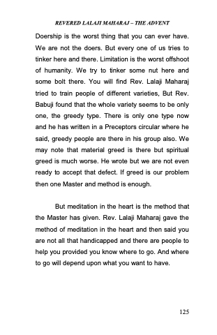 Doership is the worst thing that you can ever have. We are not the doers. But every one of us tries to tinker here and there. Limitation is the worst offshoot of humanity. We try to tinker some nut here and some bolt there. You will find Rev. Lalaji Maharaj tried to train people of different varieties, But Rev. Babuji found that the whole variety seems to be only one, the greedy type. There is only one type now and he has written in a Preceptors circular where he said, greedy people are there in his group also. We may note that material greed is there but spiritual greed is much worse. He wrote but we are not even ready to accept that defect. If greed is our problem then one Master and method is enough.