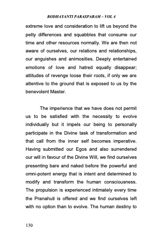 extreme love and consideration to lift us beyond the petty differences and squabbles that consume our time and other resources normally. We are then not aware of ourselves, our relations and relationships, our anguishes and animosities. Deeply entertained emotions of love and hatred equally disappear; attitudes of revenge loose their roots, if only we are attentive to the ground that is exposed to us by the benevolent Master.
