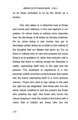 One who takes to a detached look at things and events and relations, is the real aspirant in our system, for whom there is nothing more important than the discharge of all duties as divinely ordained. He by virtue being a real human has got to discharge certain duties as a trustee is the noblest of the thoughts that our Master has given us, For us there is nothing here to own and possess but every thing is to be partaken of, rather than enjoyed, with a feeling that there is nothing except the Absolute in reality, expressing itself here in the past and the present. The anubhava or experience is a non personal unified enriched consciousness that swells into the future expressing itself in a more glorious manner. Those who tend to see values in the past are right but yet stagnated. And those who live the same values modified to suit the present are those who practice the right. But those who enrich the values keeping in view the needs of the future with a vision that is holistic are those who are the