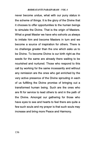 never become undue, what with our puny status in the scheme of things. It is the glory of the Divine that it chooses to offer opportunities to the human beings to simulate the Divine. That is the origin of Masters. What a great Master we have who exhorts us always to imitate him and become Masters in turn and we become a source of inspiration for others. There is no challenge greater than the one which asks us to be Divine. To become Divine is our birth right as the seeds for the same are already there waiting to be nourished and nurtured. Those who respond to this call by working for the same incessantly and without any remission are the ones who get enriched by the very active presence of the Divine sprouting in each of us fulfilling the Divine promise of bringing out a transformed human being. Such are the ones who are fit for service to lead others to and in the path of the Divine. Amongst our gathering for those who have eyes to see and hearts to feel there are quite a few such souls and my prayer is that such souls may increase and bring more Peace and Harmony.