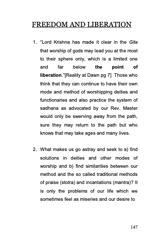 1. ―Lord Krishna has made it clear in the Gita that worship of gods may lead you at the most to their sphere only, which is a limited one and far below the point of liberation.‖[Reality at Dawn pg 7] Those who think that they can continue to have their own mode and method of worshipping deities and functionaries and also practice the system of sadhana as advocated by our Rev. Master would only be swerving away from the path, sure they may return to the path but who knows that may take ages and many lives.