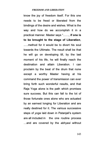 know the joy of freedom itself. For this one needs to be freed or liberated from the bindings of the desire and wishes. What is the way and how do we accomplish it in a practical manner. Master says ―......, if one is to be brought to the stage of Liberation, .....method for it would be to divert his soul towards the Ultimate. The result shall be that he will go on developing till, by the last moment of his life, he will finally reach the destination and attain Liberation. I can proclaim by the beat of the drum that none except a worthy Master having at his command the power of transmission can ever bring forth such wonderful results, and that Raja Yoga alone is the path which promises sure success. But this can fall to the lot of those fortunate ones alone who are actuated by an earnest longing for Liberation and are really destined for it. The various successive steps of yoga laid down in Patanjali's system are all included in the one routine process ...and are covered by the abhyasi without