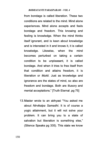 13.Master wrote to an abhyasi ―You asked me about Nirvikalpa Samadhi. It is of course a yogic attainment, but it will not solve your problem. It can bring you to a state of salvation but liberation is something else,‖ (Silence Speaks pg 335). This state we know