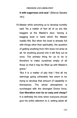 16.Master while exhorting us to develop humility said ―As a matter of fact all of us are like beggars at the Master's door, having a begging bowl in hand which the Master readily fills. But when the bowl is already full with things other than spirituality, the question of getting anything from Him does not arise at all, for anything poured into it will flow out at once. The primary thing for us to do is therefore to make ourselves empty of all these so that it may be filled up with Master's grace.‖