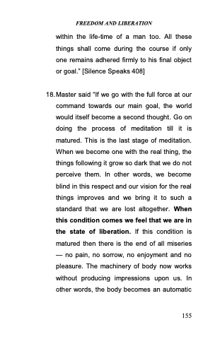 18.Master said ―If we go with the full force at our command towards our main goal, the world would itself become a second thought. Go on doing the process of meditation till it is matured. This is the last stage of meditation. When we become one with the real thing, the things following it grow so dark that we do not perceive them. In other words, we become blind in this respect and our vision for the real things improves and we bring it to such a standard that we are lost altogether. When this condition comes we feel that we are in the state of liberation. If this condition is matured then there is the end of all miseries — no pain, no sorrow, no enjoyment and no pleasure. The machinery of body now works without producing impressions upon us. In other words, the body becomes an automatic