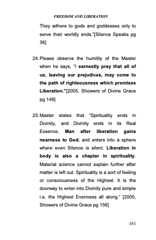 25. Master states that ―Spirituality ends in Divinity, and Divinity ends in its Real Essence. Man after liberation gains nearness to God; and enters into a sphere where even Silence is silent. Liberation in body is also a chapter in spirituality. Material science cannot explain further after matter is left out. Spirituality is a sort of feeling or consciousness of the Highest. It is the doorway to enter into Divinity pure and simple i.e. the Highest Evenness all along.‖ [2005, Showers of Divine Grace pg 156]