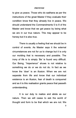 to give us peace. Those who do sadhana as per the instructions of the great Master if they evaluate their condition know that they already live in peace. We should understand the Commandments 5 to 8 of the Master and know that we get peace by being what we are in our true nature. This may appear to be heresy but it is also true.