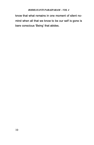 BODHAYANTI PARASPARAM – VOL 4 know that what remains in one moment of silent no- mind when all that we know to be our self is gone is bare conscious ̳Being‘ that abides. 10