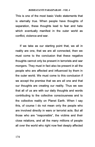 If we take as our starting point that, we all in reality are one, that we are all connected, then we must come to the conclusion that these negative thoughts cannot only be present in terrorists and war mongers. They must in fact also be present in all the people who are affected and influenced by them in the outer world. We must come to this conclusion if we accept the premise that we are all one and that our thoughts are creating our reality. Thus we see that all of us are with our daily thoughts and words contributing to the collective consciousness and to the collective reality on Planet Earth. When I say this, of course I do not mean only the people who are involved directly in wars or terrorist acts. But all those who are ―responsible‖, the victims and their close relations, and all the many millions of people all over the world who right now feel deeply affected