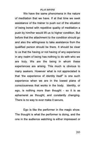 We have the same phenomena in the nature of meditation that we have. If at that time we seek assistance of the trainer to push out of the situation of being bored with repetitive quality of meditation a push by him/her would lift us to higher condition. But before that the attachment to the condition should go and also the willingness to take assistance from the qualified person should be there. It should be clear to us that the having or not having of any experience in any realm of being has nothing to do with who we are truly. We are the being in whom these experiences are arising. This much is obvious to many seekers. However what is not appreciated is that ̳the experience of identity itself‖ is one such experience when we are in the lowest plane of consciousness that works in the body. Identity, or ego, is nothing more than thought - so it is as ephemeral as thought, and constantly changing. There is no way to ever make it secure.