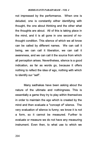 not impressed by the performance. When one is deluded, one is constantly either identifying with thought, the one about thinking and the other what the thoughts are about. All of this is taking place in the mind, and it is all gone in one second of no- thought condition. This silence of which we all know can be called by different names. We can call it being, we can call it liberation, we can call it awareness, and we can call it the source from which all perception arises. Nevertheless, silence is a good indication, as far as words go, because it offers nothing to reflect the idea of ego, nothing with which to identify our ―self‖.