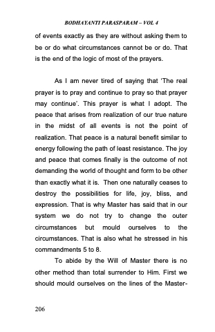 As I am never tired of saying that ̳The real prayer is to pray and continue to pray so that prayer may continue‘. This prayer is what I adopt. The peace that arises from realization of our true nature in the midst of all events is not the point of realization. That peace is a natural benefit similar to energy following the path of least resistance. The joy and peace that comes finally is the outcome of not demanding the world of thought and form to be other than exactly what it is. Then one naturally ceases to destroy the possibilities for life, joy, bliss, and expression. That is why Master has said that in our system we do not try to change the outer circumstances but mould ourselves to the circumstances. That is also what he stressed in his commandments 5 to 8.