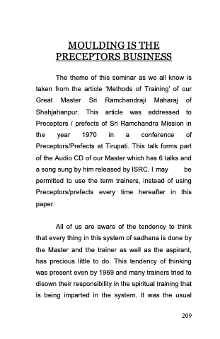 The theme of this seminar as we all know is taken from the article ̳Methods of Training‘ of our Great Master Sri Ramchandraji Maharaj of Shahjahanpur. This article was addressed to Preceptors / prefects of Sri Ramchandra Mission in the year 1970 in a conference of Preceptors/Prefects at Tirupati. This talk forms part of the Audio CD of our Master which has 6 talks and a song sung by him released by ISRC. I may be permitted to use the term trainers, instead of using Preceptors/prefects every time hereafter in this paper.