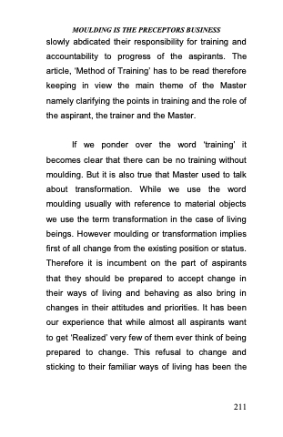 slowly abdicated their responsibility for training and accountability to progress of the aspirants. The article, ̳Method of Training‘ has to be read therefore keeping in view the main theme of the Master namely clarifying the points in training and the role of the aspirant, the trainer and the Master.